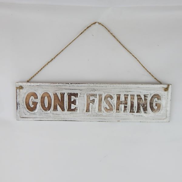 Sign "Gone Fishing" Nat/White 40cm x 10cm high