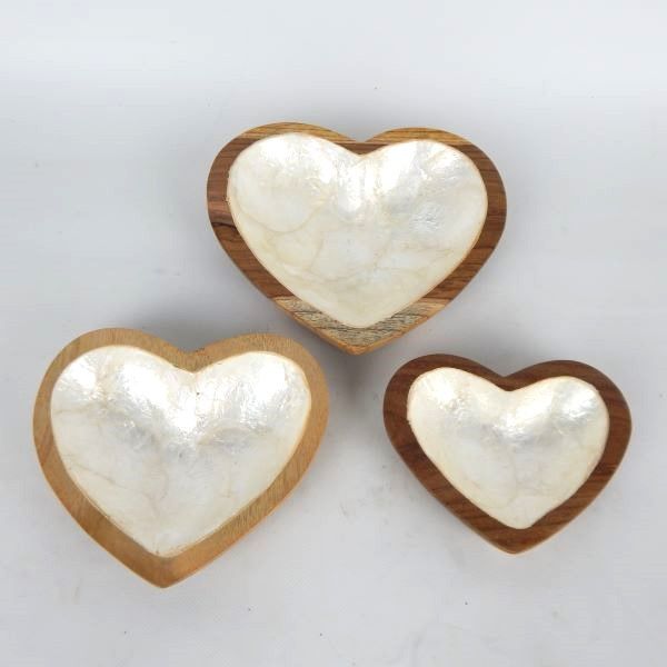 Teak/Shell Heart Dishes s/3 12x10/14x12/16x14cm
